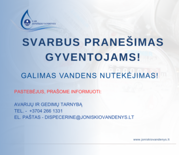 Dėl galimai įvykusio vandentiekio vamzdyno gedimo gali būti vandens nutekėjimų ir užliejimų, todėl prašome skubiai patikrinti butus, rūsius, technines patalpas,…