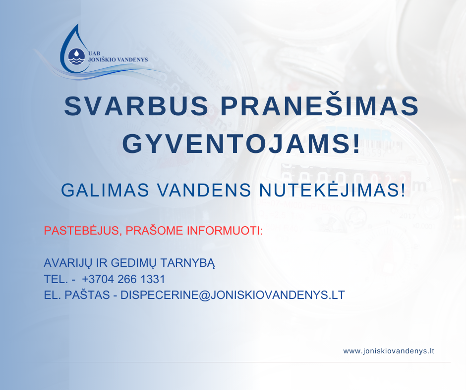 Jeigu pastebėsite: bėgantį vandenį ar užlietą patalpą NEDELSDAMI informuokite AVARIJŲ IR GEDIMŲ TARNYBĄ – tel. nr +37042661331 ar el. paštu dispecerine@joniskiovandenys.lt.