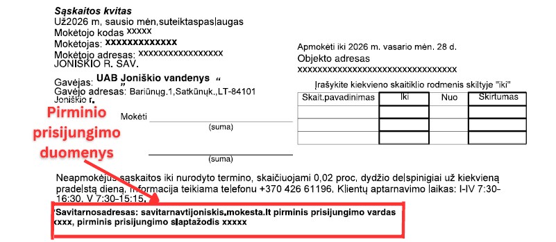 Informaciją apie pirmą prisijungimą ir prisijungimo duomenis bus pažymėti suformuoti mokėjimo pranešimo apačioje: